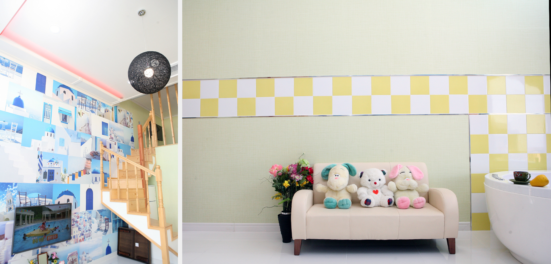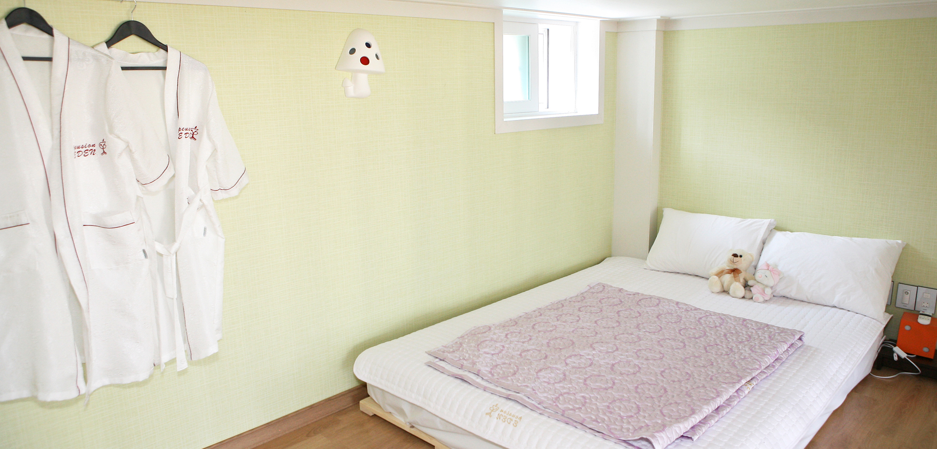 침실 : TV, 침대, 전등, 블라인드 거실 : TV, TV테이블, 소파, 시계, 병따개, 재떨이, 쓰레기통, 월풀, 거울, 헤어드라이기, 빗, 스킨, 로션 접시大, 접시小, 종지 2개, 수저통, 수저 4벌, 머그컵 2개, 냄비대大中小 각1개, 쟁반, 믹스볼 야채세척볼, 후라이팬, 냄비받침대, 칼, 가위, 국자, 뒤집개, 고무장갑, 수세미, 행주, 주방세제, 음식물쓰렉통 화장실 : 비누 2개, 샴푸, 린스, 바디워시, 폼클렌징 2개, 목욕타월, 수건3개, 치솔 2개, 치약 2개 인터넷 : 무료 wi-fi 서비스 : 생수 작은것 2개 |