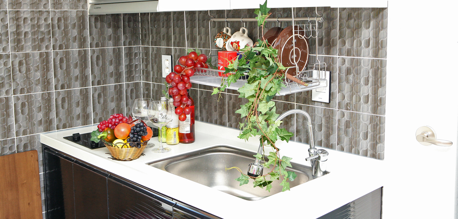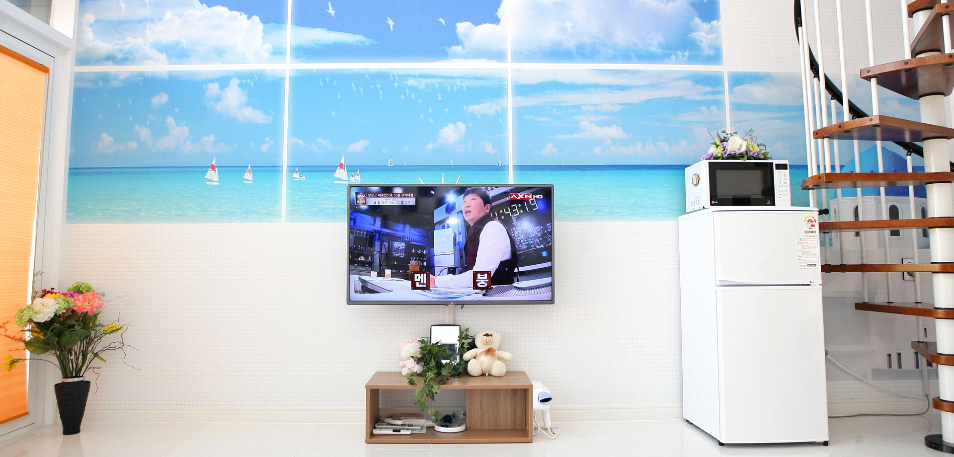 침실 : TV, 침대, 전등, 블라인드 거실 : TV, TV테이블, 소파, 시계, 병따개, 재떨이, 쓰레기통, 월풀, 거울, 헤어드라이기, 빗, 스킨, 로션 접시大, 접시小, 종지 2개, 수저통, 수저 4벌, 머그컵 2개, 냄비대大中小 각1개, 쟁반, 믹스볼 야채세척볼, 후라이팬, 냄비받침대, 칼, 가위, 국자, 뒤집개, 고무장갑, 수세미, 행주, 주방세제, 음식물쓰렉통 화장실 : 비누 2개, 샴푸, 린스, 바디워시, 폼클렌징 2개, 목욕타월, 수건3개, 치솔 2개, 치약 2개 인터넷 : 무료 wi-fi 서비스 : 생수 작은것 2개 |