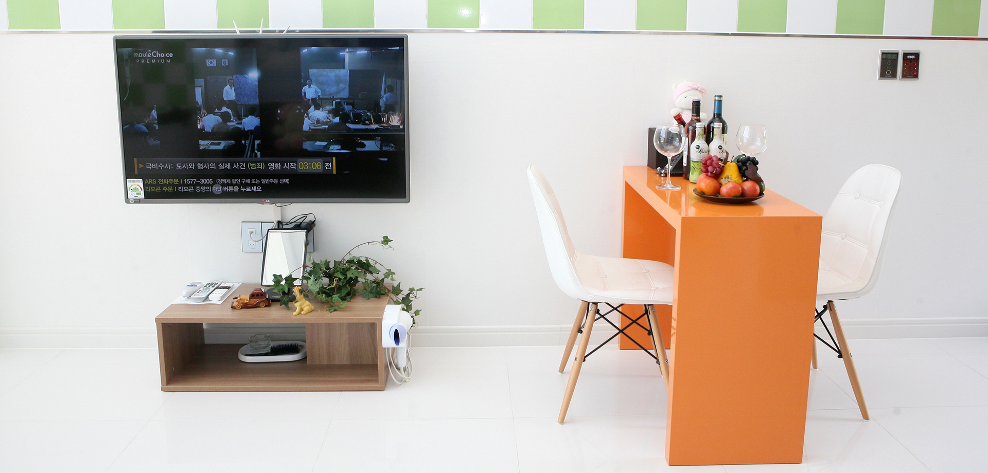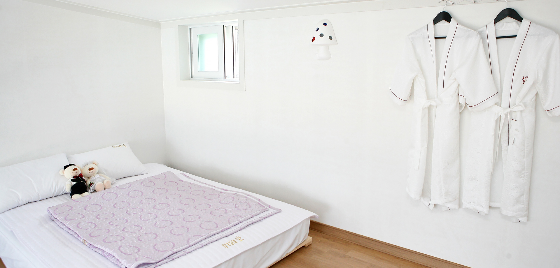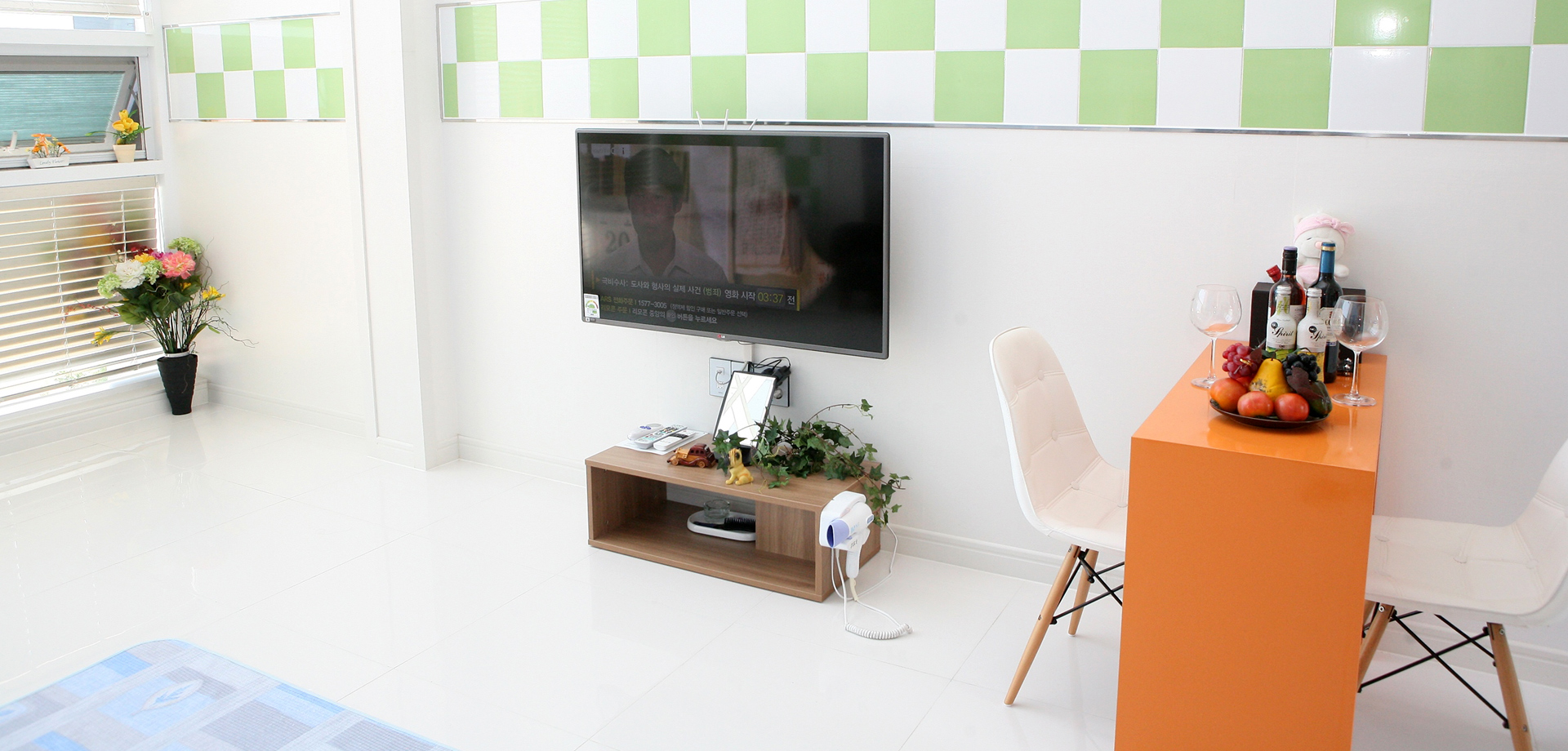침실 : TV, 침대, 전등, 블라인드 거실 : TV, TV테이블, 소파, 시계, 병따개, 재떨이, 쓰레기통, 월풀, 거울, 헤어드라이기, 빗, 스킨, 로션 접시大, 접시小, 종지 2개, 수저통, 수저 4벌, 머그컵 2개, 냄비대大中小 각1개, 쟁반, 믹스볼 야채세척볼, 후라이팬, 냄비받침대, 칼, 가위, 국자, 뒤집개, 고무장갑, 수세미, 행주, 주방세제, 음식물쓰렉통 화장실 : 비누 2개, 샴푸, 린스, 바디워시, 폼클렌징 2개, 목욕타월, 수건3개, 치솔 2개, 치약 2개 인터넷 : 무료 wi-fi 서비스 : 생수 작은것 2개 |
